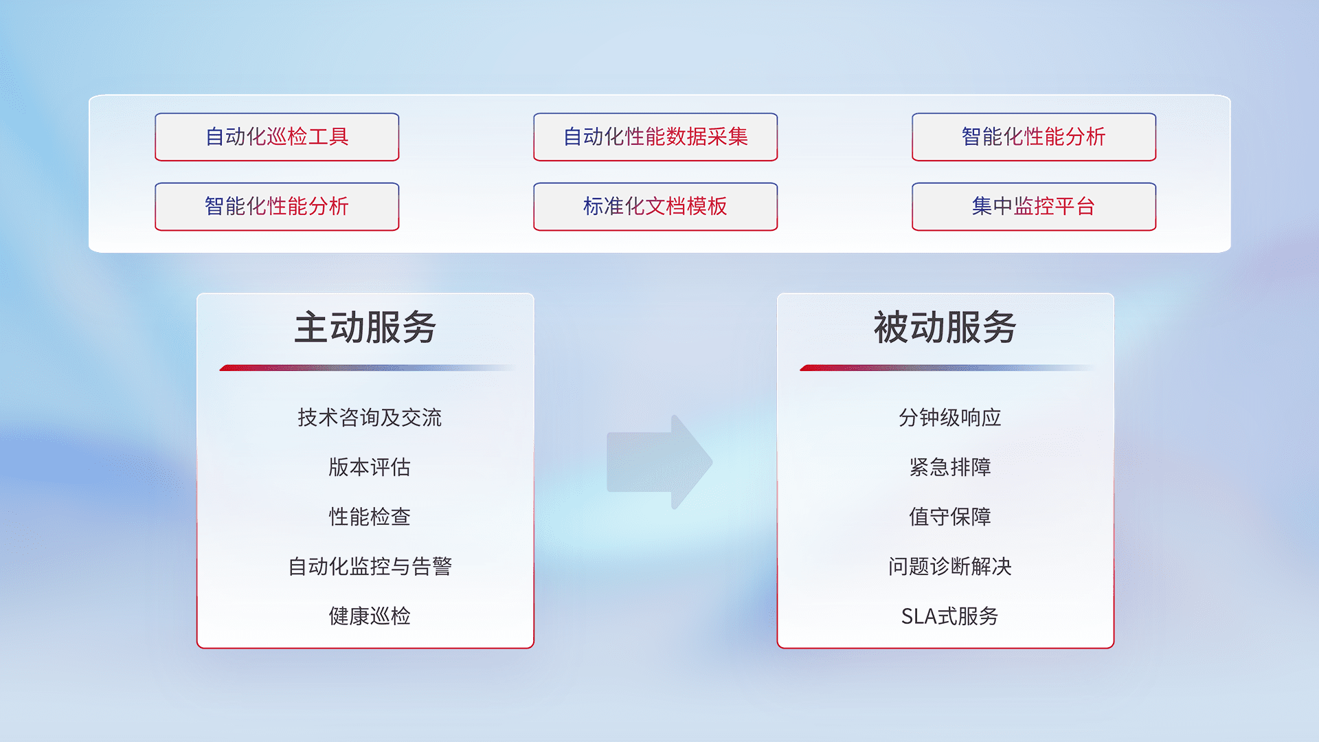 智能化工具和标准化文档,,,,保障服务质量,,提供主动服务(包含技术咨询、、、版本评估、、、、性能检查、、自动化监控与告警、、、、健康巡检)和被动服务包含(分钟级响应、、、紧急排障、、值守保障、、问题诊断解决、、、SLA服务)。。。。